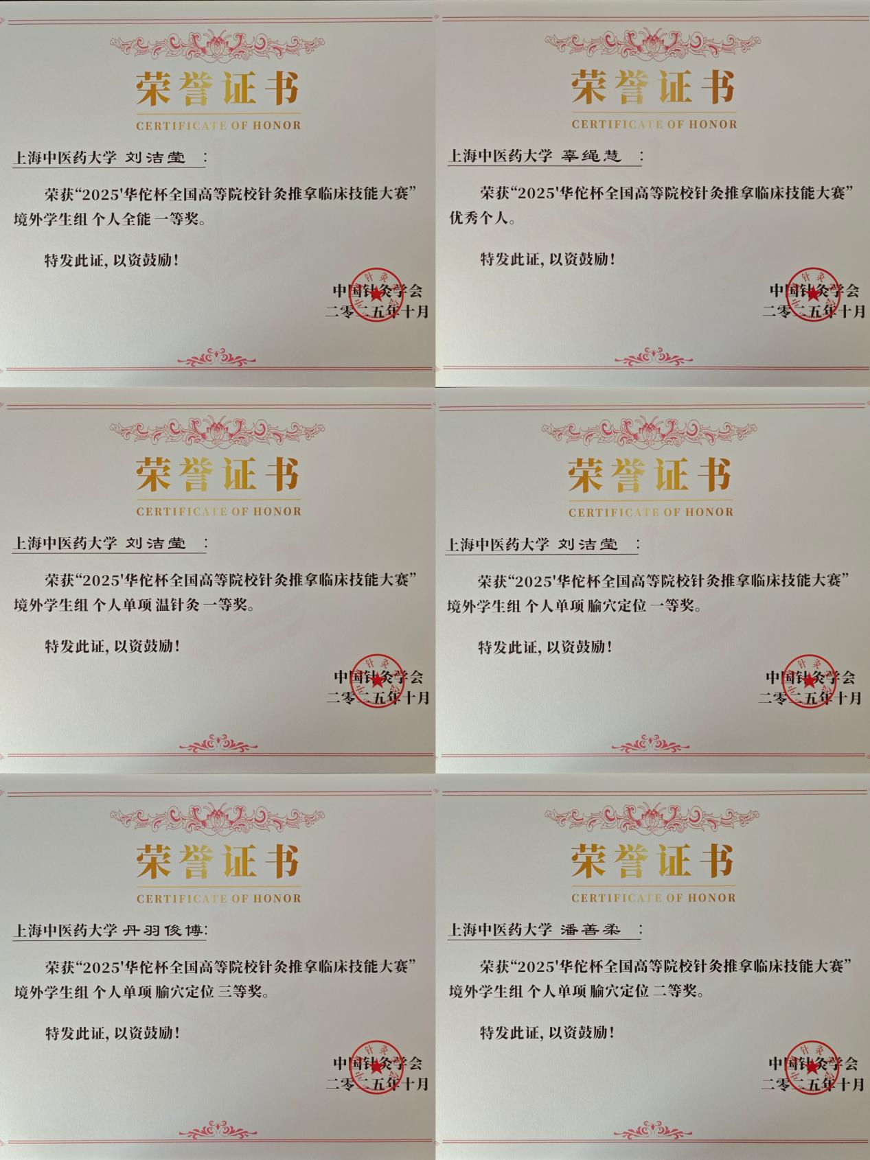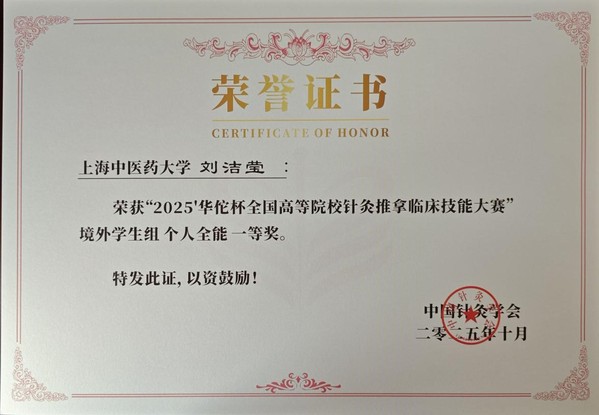 金秋十月,硕果盈枝。10月17日至19日,2025年“华佗杯”全国高等院校针灸推拿临床技能大赛在陕西咸阳成功举办。本届大赛由中国针灸学会与全国中医药高等教育学会联合主办,陕西中医药大学承办。我校4名国际学生在竞赛中脱颖而出,斩获三金、二银、一铜的好成绩,刘洁莹同学荣获个人全能奖一等奖。