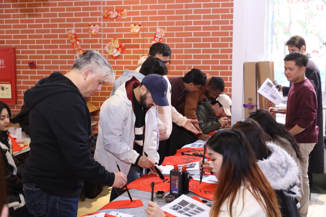 春节,是中华民族的传统佳节,饱含着人们对新一年的美好憧憬与祝福。留学生们手握毛笔,饱蘸墨汁,在红纸上挥毫书写福字。一个个福字形态各异,却都洋溢着浓浓的年味,承载着对新年的美好祝愿。这些福字不仅是书法艺术的展现,更是对传统文化的传承与弘扬,大家互相赠送福字,传递着温暖与祝福。