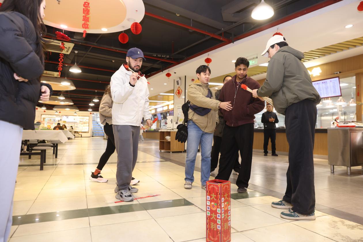 投壶是中国古代传统的礼仪和游戏,留学生们手持箭矢,瞄准远处的壶身,纷纷投出手中的箭。若投中壶内3次,便可获得精美小礼品一份。这个游戏既考验了大家的眼力和手力,又增添了节日的趣味性。现场不时传来阵阵欢呼声和喝彩声,大家在欢声笑语中感受着传统游戏的魅力,迎接新年的到来。