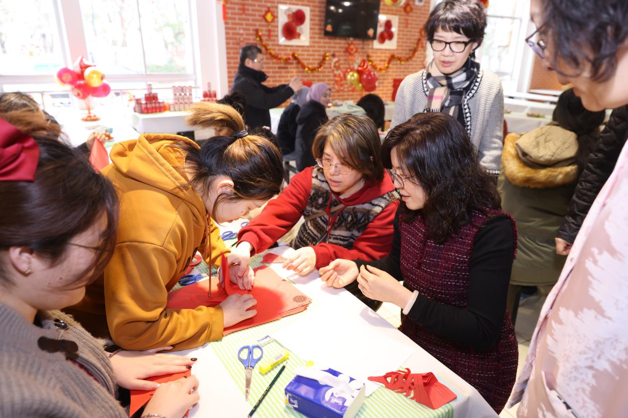 与此同时,剪“红”映喜的环节也进行得如火如荼。留学生们拿着剪刀,在红色的彩纸上精心裁剪。不一会儿,各式各样的窗花便诞生了,有传统的喜鹊登梅、鲤鱼跃龙门等吉祥图案,也有充满创意的现代设计。这些精美的窗花为活动现场增添了一抹亮丽的色彩,更寓意着大家将在新的一年里生活红红火火。