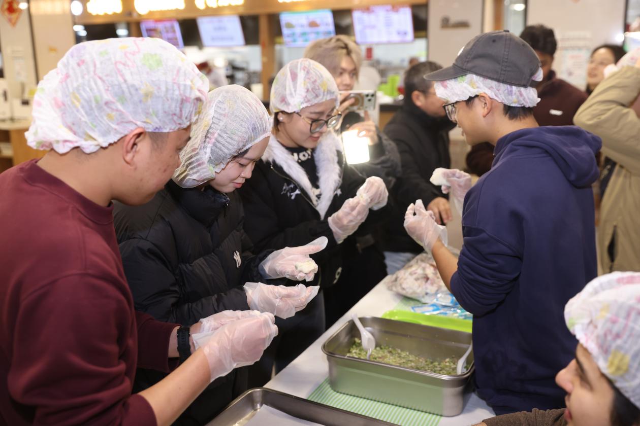 饺子作为春节期间的传统美食,象征着团圆和幸福。来自世界各地的留学生和校领导、老师们围坐在一起,共同包饺子。大家一边交流包饺子的技巧,一边分享着自己国家的春节习俗。王副校长拿起一张饺子皮,边示范边笑着说:“饺子是中国春节的传统美食,把馅放中间对折,捏出褶子,就像把团圆和福气紧紧包在里面啦。”在欢声笑语中,一个个饱满的饺子诞生了。与此同时,同学们纷纷上台,用歌声表达对新年的祝福。悠扬的歌声回荡在食堂里,让大家沉浸在欢乐祥和的节日氛围中。