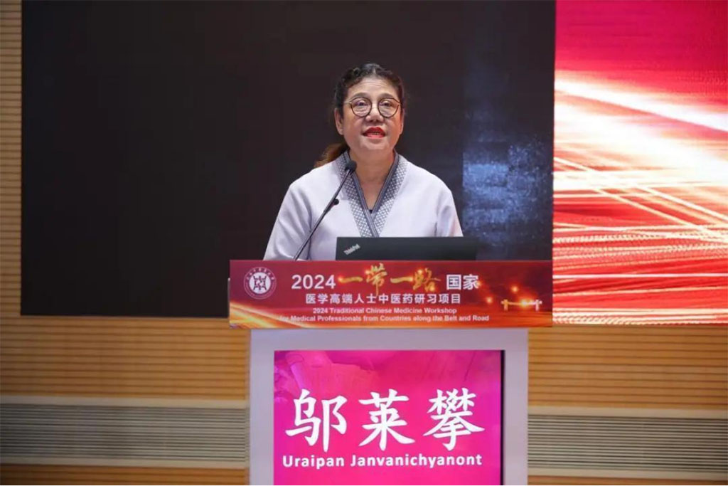 ワークショップの参加者らを代表して、タイの華僑崇聖大学の邬莱攀学長がご挨拶を行い、上海中医薬大学との20年以上にわたる協力関係を振り返りながら、両校が共同で設立したタイ初の中医薬専攻がタイの中医薬業界のために1000人近い人材を育成し、タイと東南アジアにおける中医薬のサービス能力を大いに高めたと紹介した。